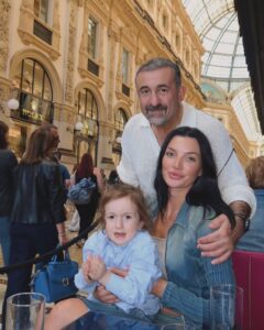 მოდელი ისტორიული შენობების ფონზე პოზირებს, მასთან ერთად იმყოფება მისი რჩეული დავით კოდუა და მათი პატარა ქალიშვილი.