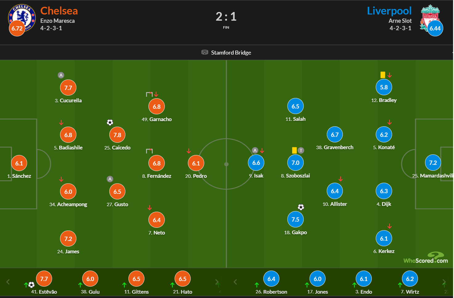საბოლოოდ – 2:1 ჩელსის სასარგებლოდ. Whoscored.com-მა ქართველის თამაში 7.2 ქულით შეაფასა. გიორგის ანგარიშზე 4 სეივია.